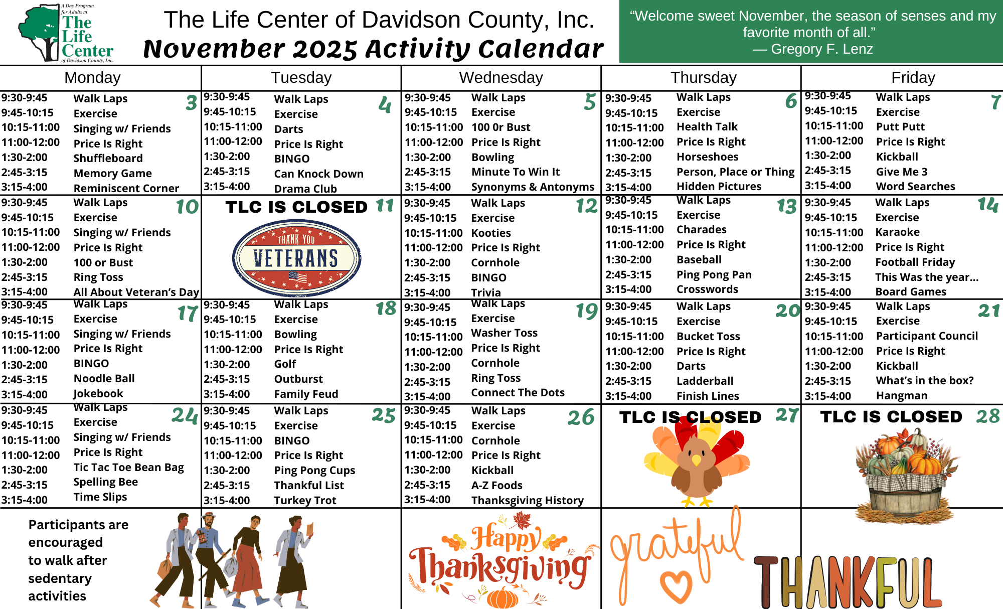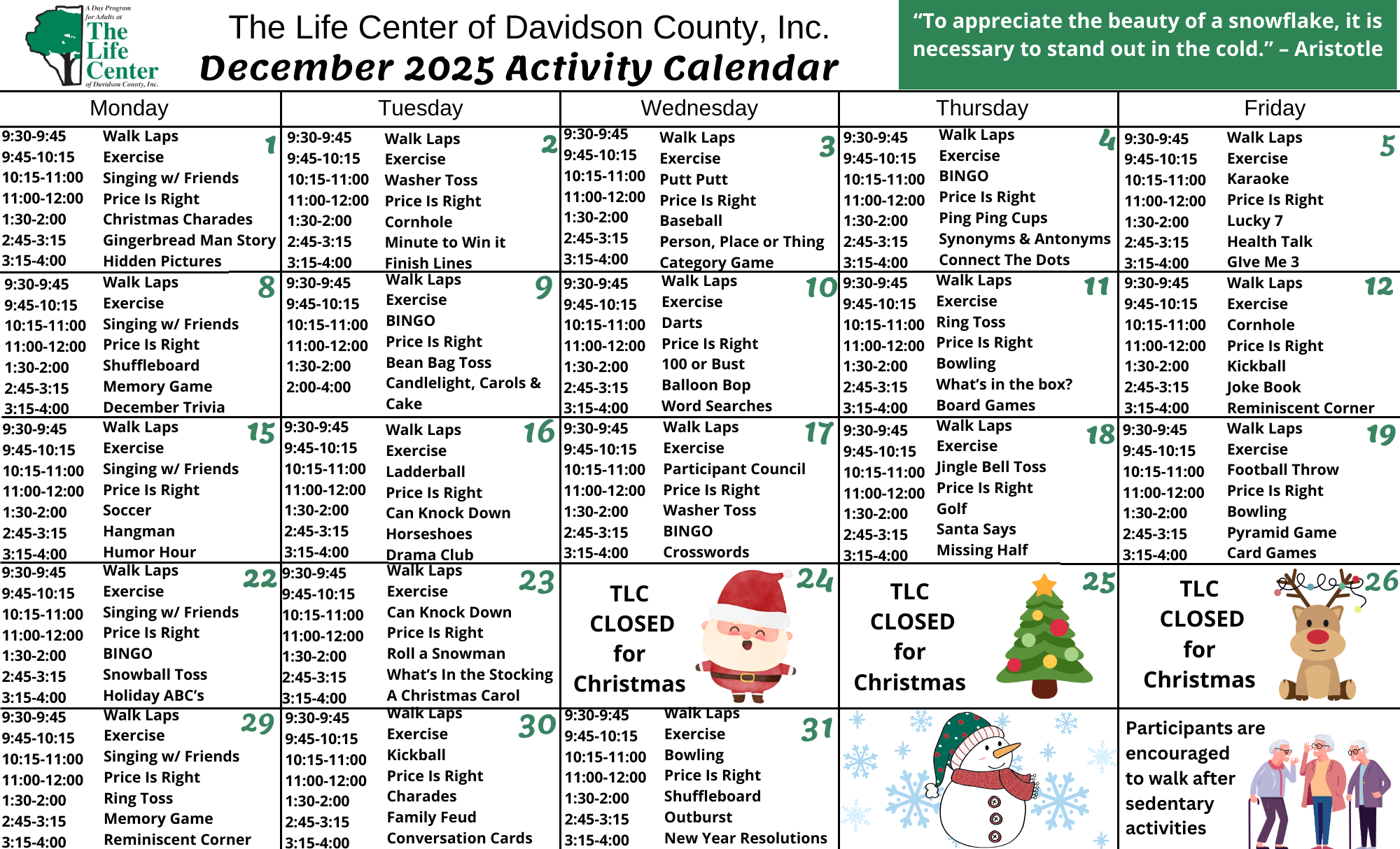 We offer a variety of activities designed to enhance the participants’ feeling of self-worth and usefulness, stimulate creativity, and provide safety, enjoyment, and fun. Activities are planned to meet the interests, needs, and abilities of the participants with an emphasis placed on utilizing strengths. Time is also scheduled for rest and relaxation.