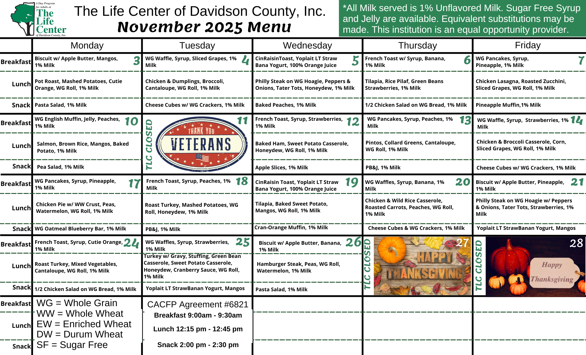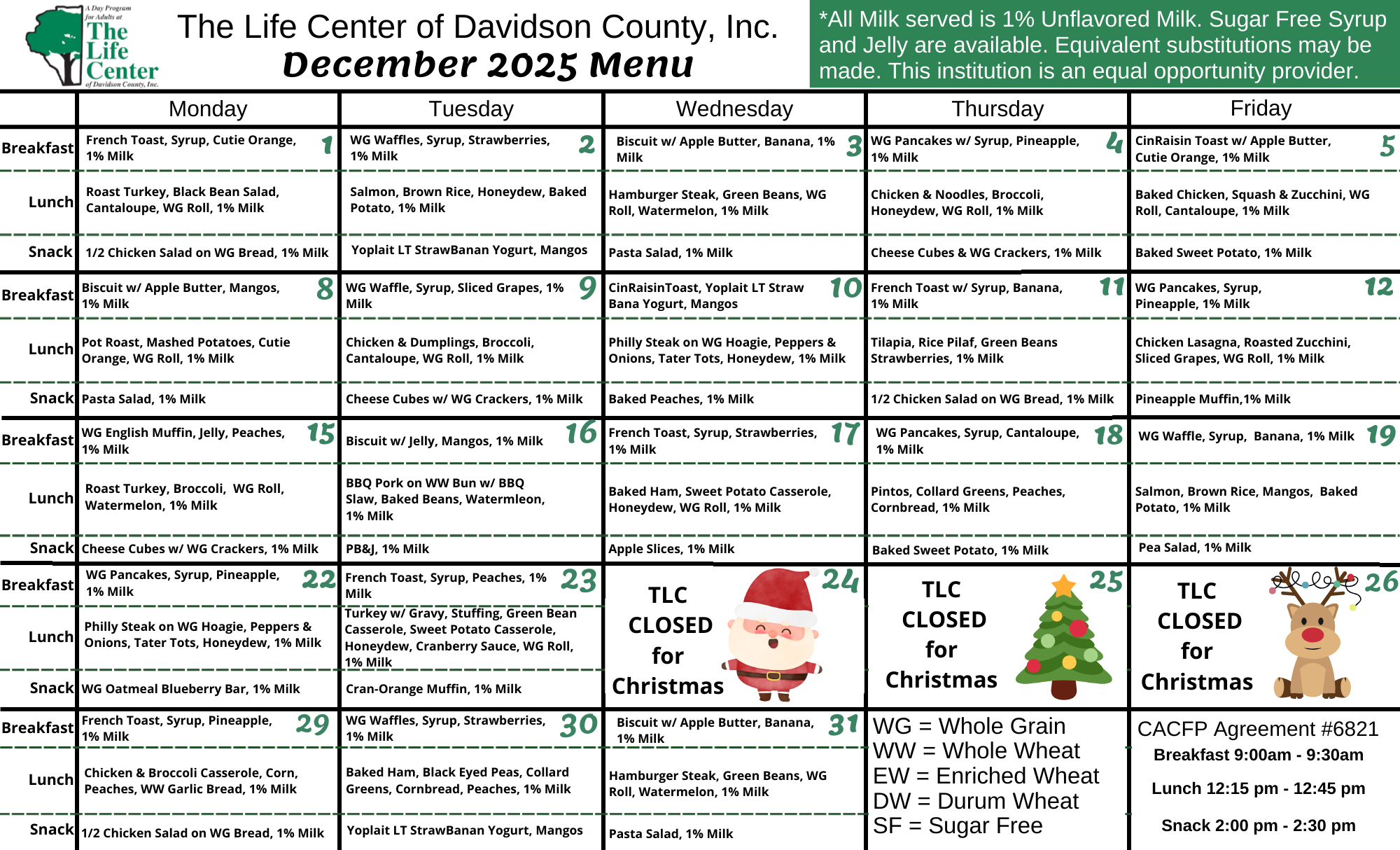 A nutritious breakfast, lunch, and afternoon snack are provided. All meals are made on- site with fresh ingredients and are approved by our registered dietitian. The Life Center provides modified diets as ordered by the participants’ physician. Some examples of therapeutic diets are: vegetarian, cut-up, ground, and thickeners.